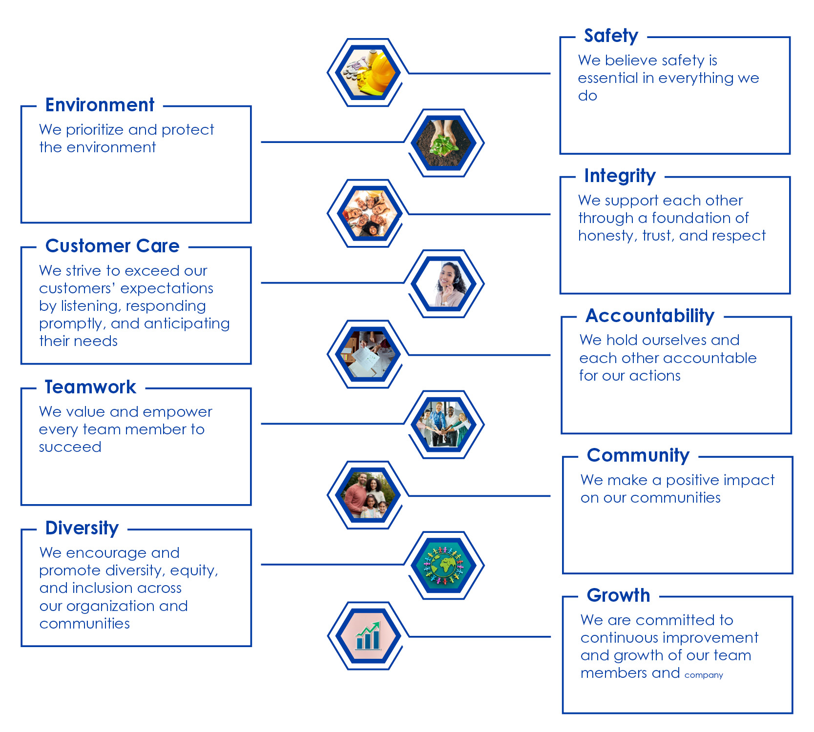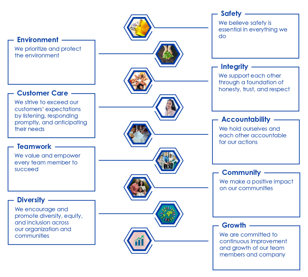 BWC Terminals’ Core Values reflect a strong commitment to safety, integrity, and environmental stewardship while fostering a culture of growth, diversity, and teamwork. The company emphasizes accountability and customer care, striving to exceed expectations through responsive service and mutual respect. By supporting communities and empowering employees, BWC creates a workplace grounded in continuous improvement, inclusion, and shared success.
